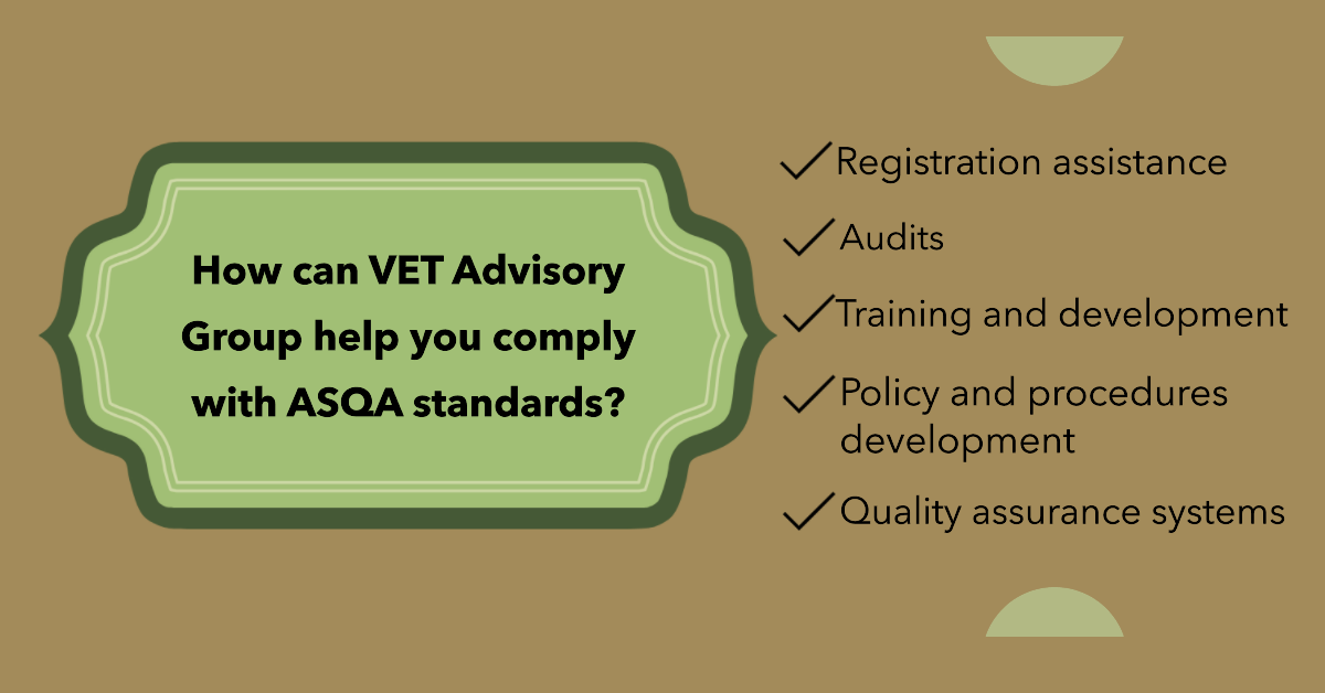 If you are an RTO in Australia, the VET Advisory Group can help you comply with ASQA standards. We offer a range of services, including registration assistance, audits, training and development, policy and procedure development, and quality assurance systems. Contact us.