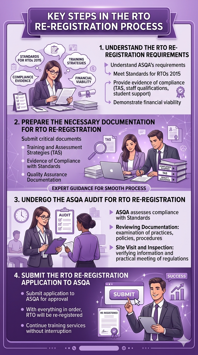 - Expert Guidance Through the Process VET Advisory Group offers tailored assistance to help you navigate the complexities of RTO Re-registration. From documentation preparation to compliance checks, our team ensures that your application is fully compliant, reducing the risk of rejection or delays.